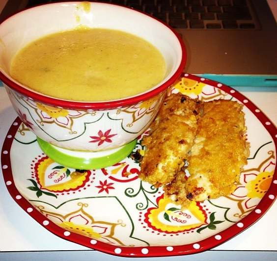 Yet another improvised recipe: Dumpling squash soup and baked cornflake chicken tenders. I bought this cute little dumpling squash on sale when I went apple picking with my friends, and I decided to make it into soup. It was very simple. I halved the squash and oven roasted it until tender, then scooped out the meat into a blender with some skim milk and pureed it until it was a smooth and creamy soup. Then I put it back into a pot and added some salt, pepper, and nutmeg. It was a little bit stuck between savory and sweet, so I might try to go more towards an extreme the next time I make it, but it was super delicious!